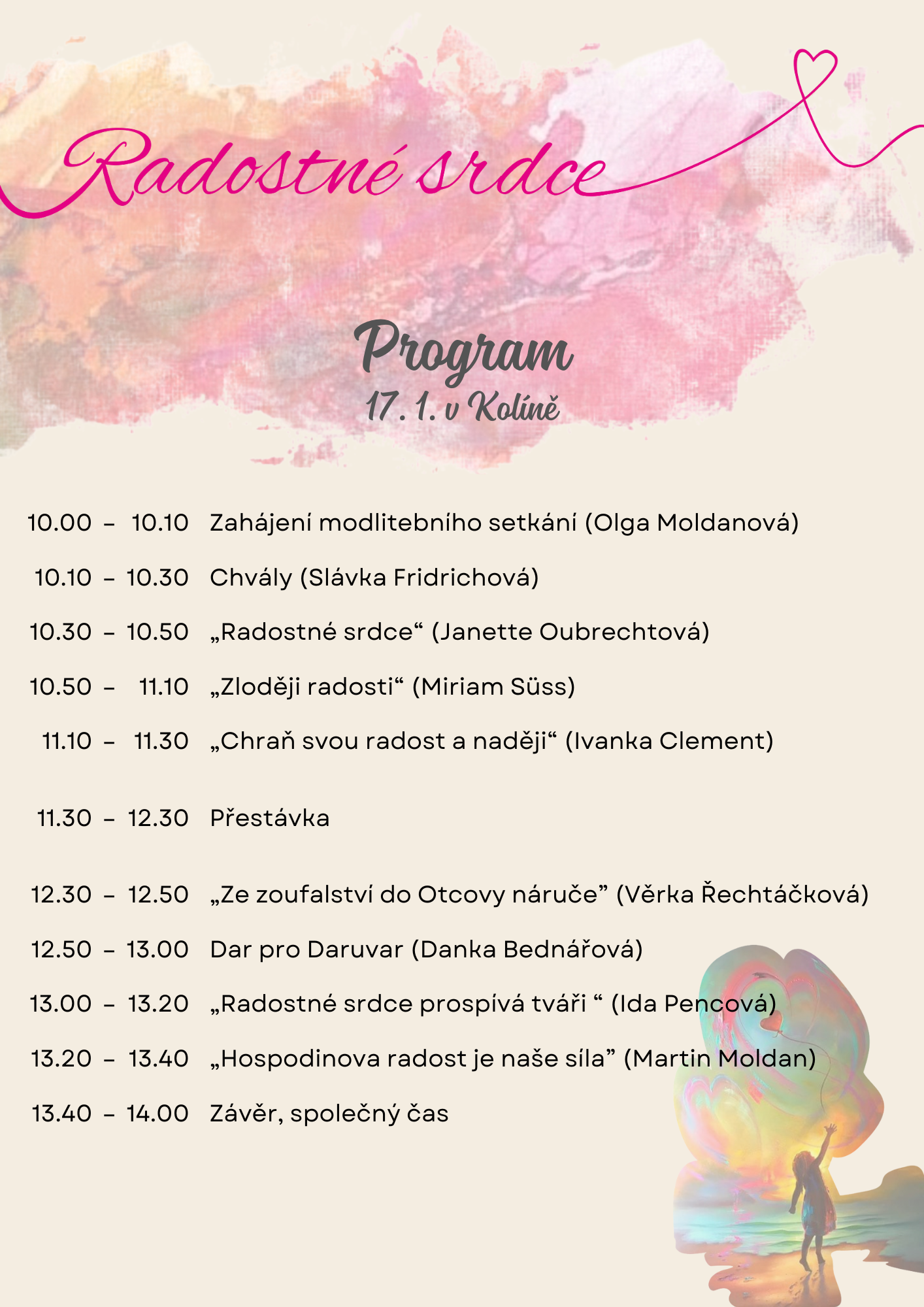 Srdečně Vás všechny zveme na naše lednové modlitební setkání pro ženy pod názvem RADOSTNÉ SRDCE. Akce proběhne 17.1. 2026 v AC Kolín od 10:00-14:00, vstup je zdarma, bez registrace.